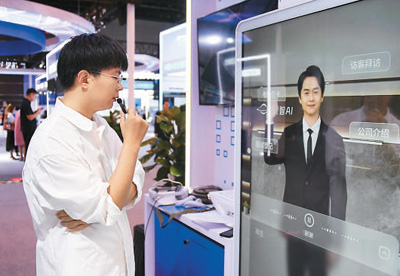 2024年7月,工作人员在2024全球数字经济大会数字经济沉浸式体验区与数字人交流。